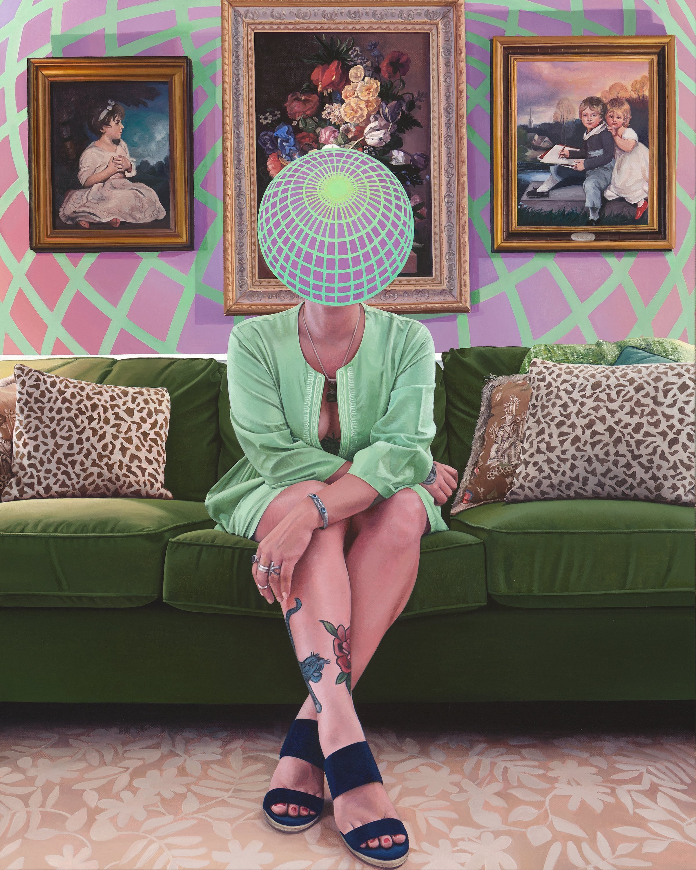 In my most current work of ‘Orb Heads’, each oil painting bridges the gap from historical time periods to modern day through the juxtaposition of vibrant designs and traditional renderings of flesh and form. Allowing ritual and divination to bury itself into special elements within still-life objects and adornments such as clothing, body art and jewelry. A “Cabinet of curiosities”, a Wunderkammer, so to say. These ‘Orb Heads’ create a bit of mystery. They begin to speak their own language through the mess of swirling colors and pattern. With each orb expressing its own vibration iteratively, expanding its self outward to areas contained within the canvas surface.
